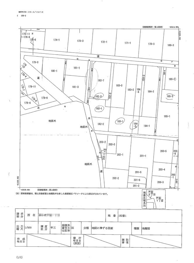This map usually looks a bit different from a typical map. (In Japan people often own several land lots for one house.) Using the land lot number information from the Land Registration documents, you can check the land shape and the relation with the public road. If the land is not connected to a public road, usually the land value will be lower. People tend to prefer lots that are adjacent to a public road rather than a private road.