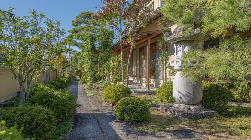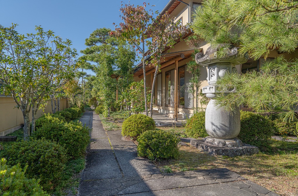 The home is fully surrounded by a beautifully maintained Japanese garden, including dry landscape features (枯山水)